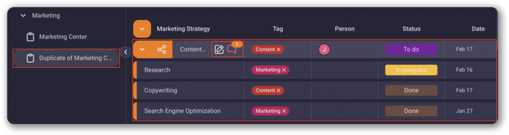 The Board with the duplicated structure, Items, Comments, Files, or any other added updates will appear in the sidebar on the left.