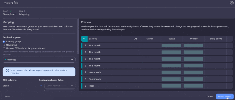 – Choose CSV column for a group name (select the column from the dropdown menu if you want data to be imported to a group created based on one of the CSV columns) - Map to which Board Fields you want to import the data from the CSV:
