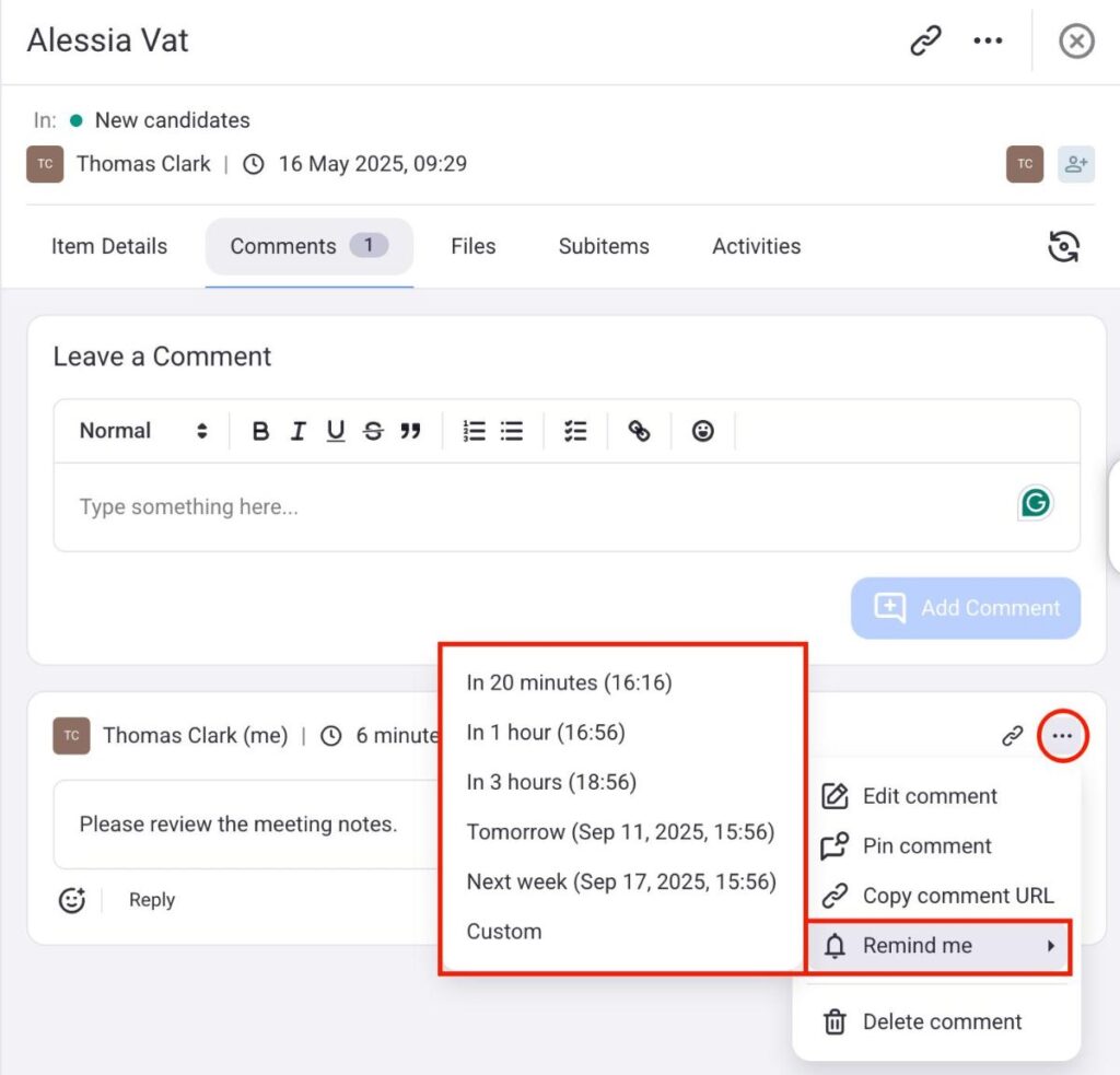 If you want to be reminded about a specific comment at a particular time, you can set up reminders. Here’s how to do it: