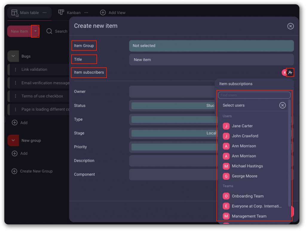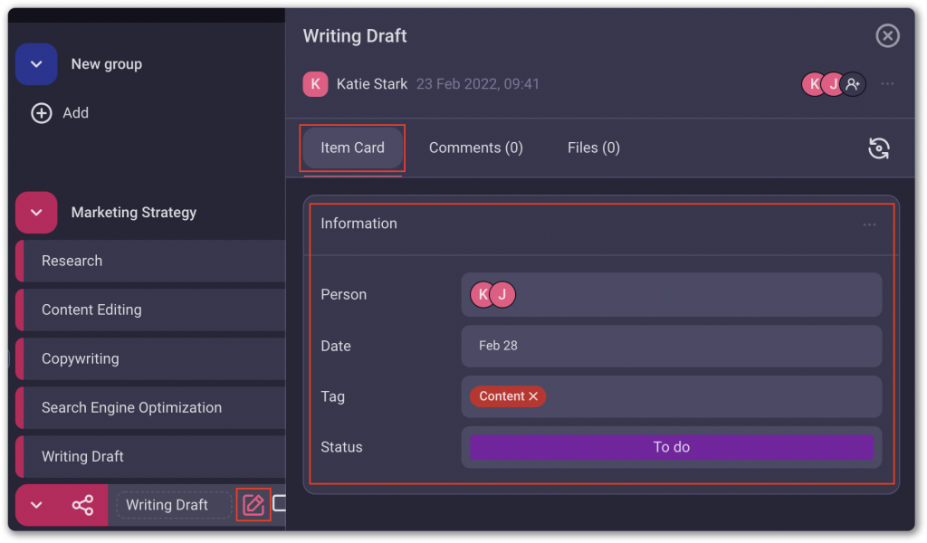 Once created, all Item components can be edited and modified according to your needs. All information related to the Item can be edited in the Item Card section. Additionally to that, you can also add Comments, Files, Item subscribers and check Activity log.