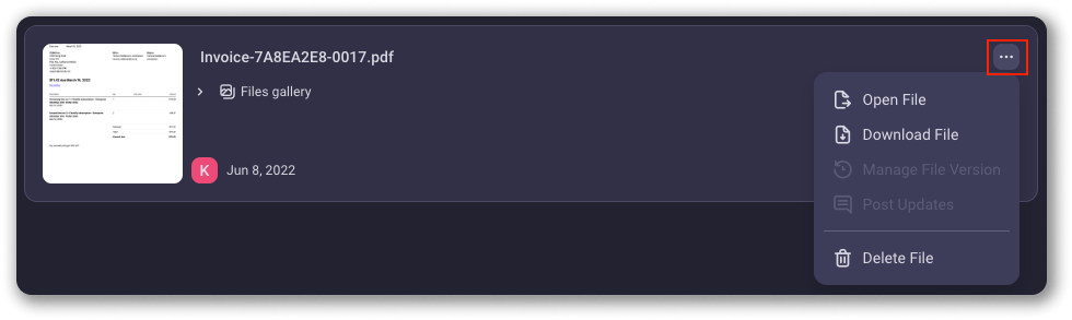 Once the file has been uploaded, it can be opened, downloaded and deleted by clicking the three dots button in the upper right corner.