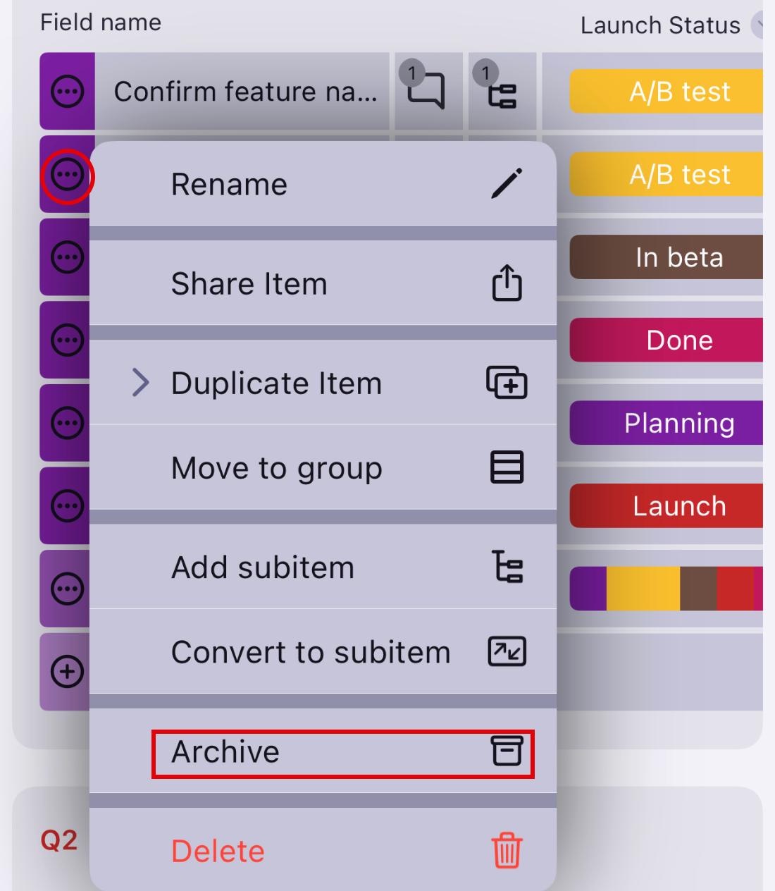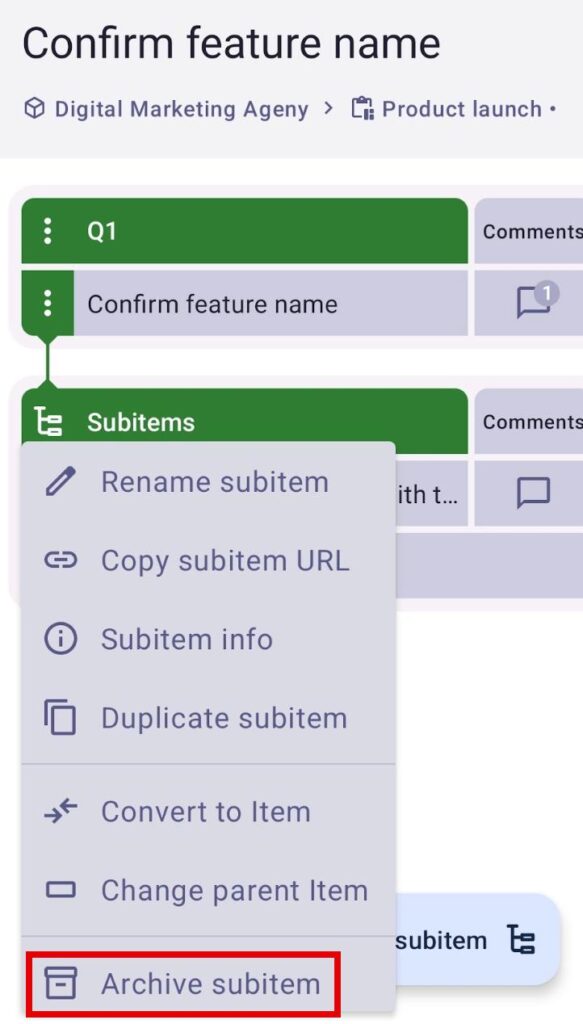 2. Select Archive Subitem to complete the action