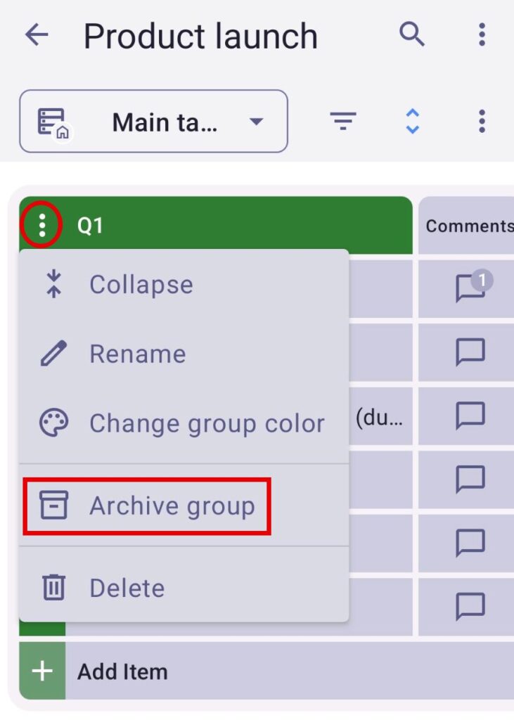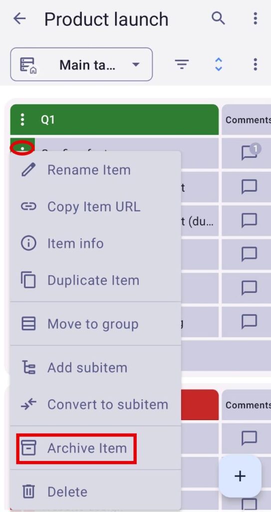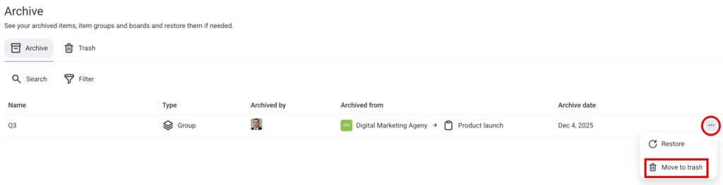 To archive a Board, Item group, Item, or a Subitem, follow these steps: