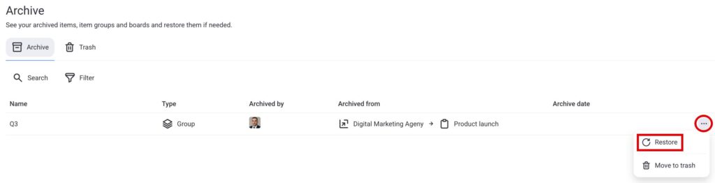 Restore is available for Item groups only if the Board they belong to is not also archived or deleted. For Items it is available if their Board is not also archived or deleted, and if their item group is not permanently deleted.
