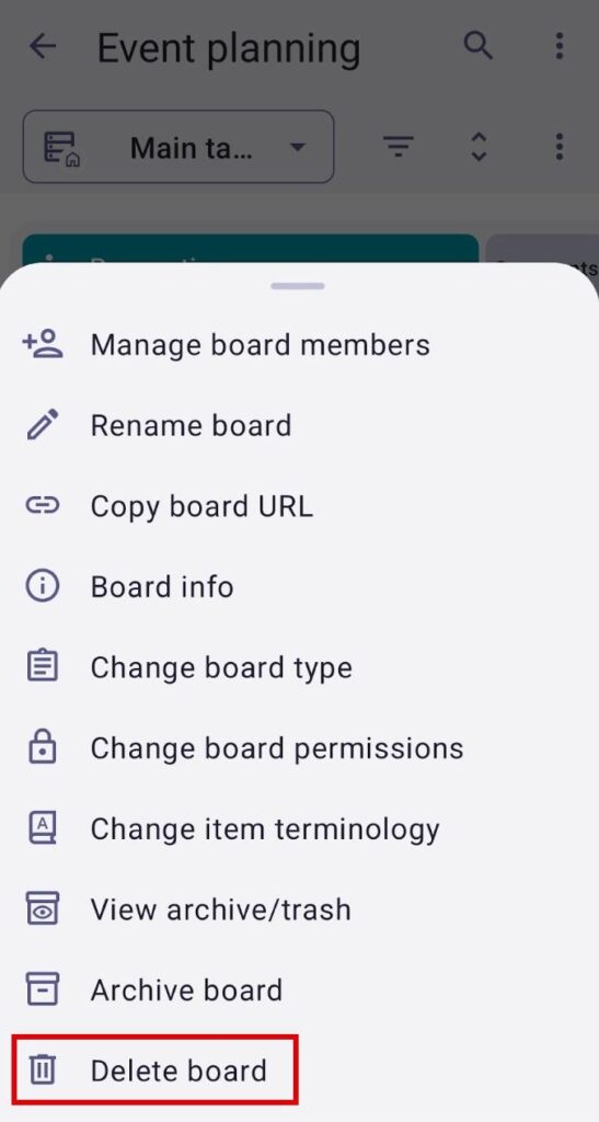 Assim que o quadro for excluído, todos os itens, comentários, arquivos e outras modificações também serão excluídos.