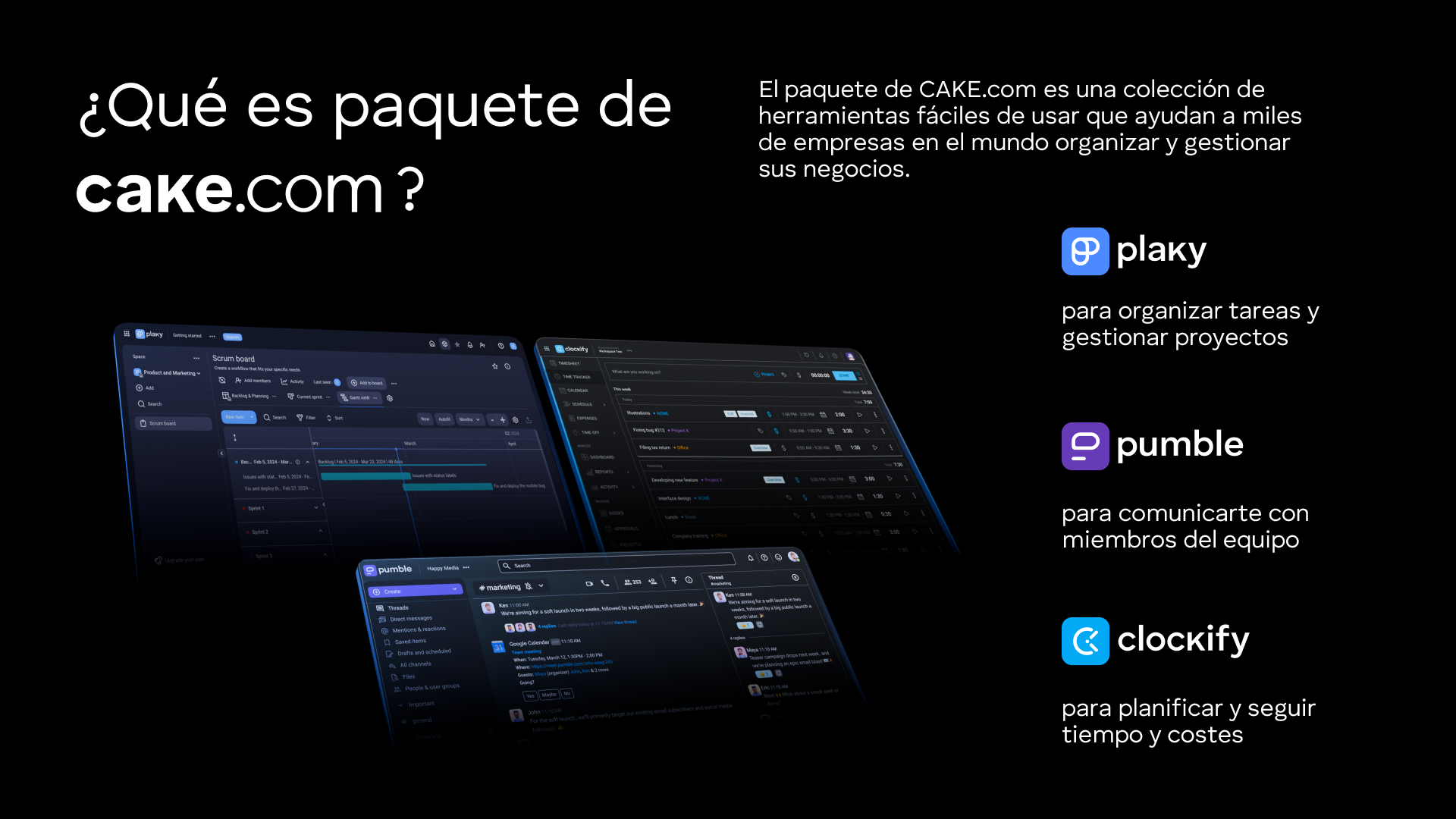 CAKE.com Bundle ofrece más de una colección de herramientas. Con Plaky, Pumble y Clockify trabajando juntos obtienes un ecosistema fluido que es fácil de usar, ¡no se requiere ningún conocimiento anterior!