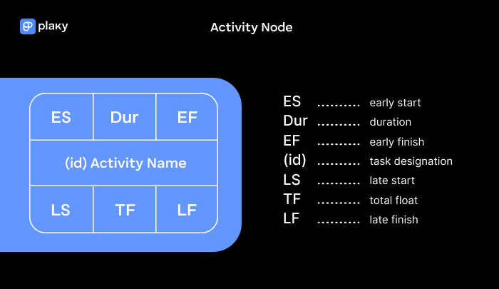 - Activity nodes — rectangles or boxes used in CPM diagrams designed to hold all the crucial information needed for charting a project’s critical path.