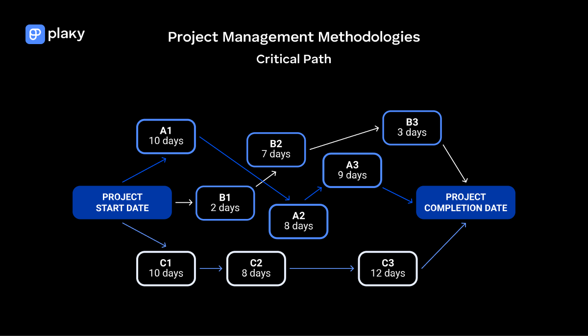 In the diagram above, the C1-C2-C3 string of activities constitutes the critical path, as they take 30 days to complete.