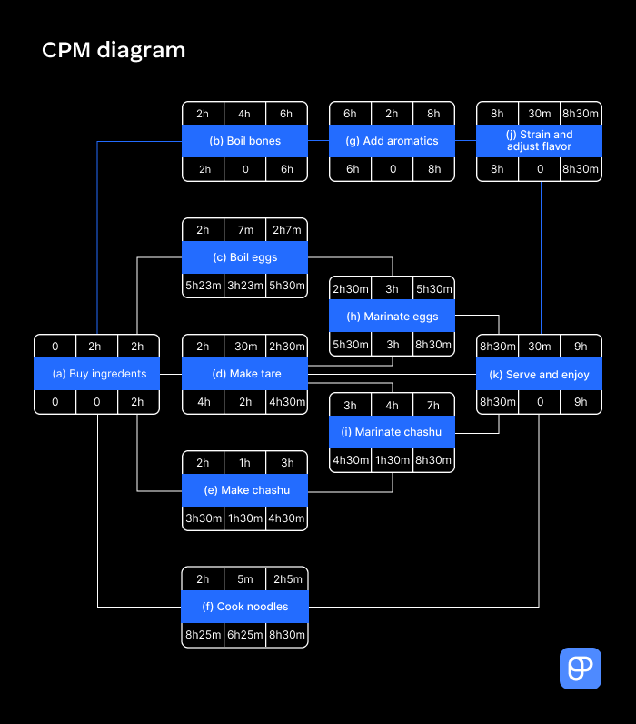 In the culinary example of CPM shown in the image above, tasks (c) and (f) both serve as good examples of tasks with free float. Even if they use up their float, it won’t affect any subsequent tasks.