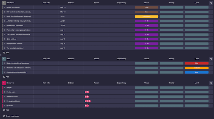 | Dependencies | – SEO analysis and content preparation are completed before data entry – Basic functionalities and advanced filtering are developed before data entry – Payment processing setup is done before GDPR implementation – The Consent Management Platform (CMP) is implemented before the website launch – Website testing is done before the launch |