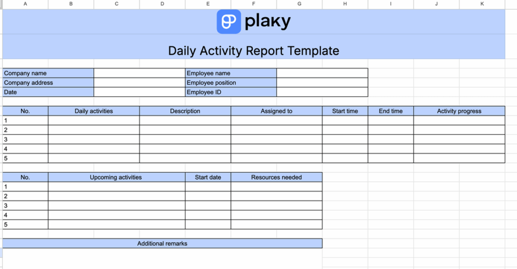 Along with this data, you can list upcoming activities, their start dates, and resources needed for each activity. Plus, you can write down any additional remarks in regard to the report.