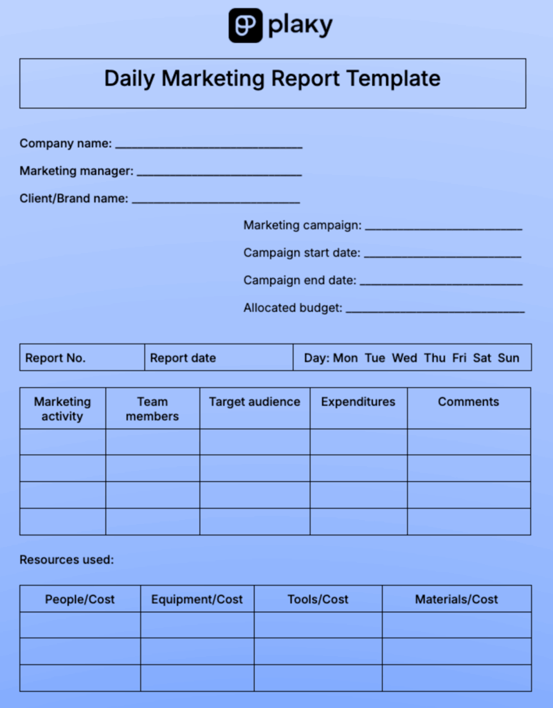 Our daily marketing report template should help you keep up with all the activities taking place during your marketing campaigns and ensure you don’t lose track of any details.
