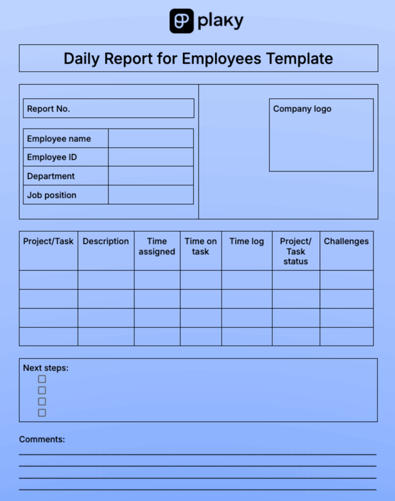 By filling out this type of template on a daily basis, your employees can learn more about their work organization and get a better understanding of their own time management. Also, when managers get reports like these every day, they can reschedule and plan new assignments.