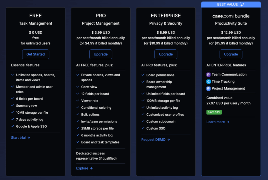 What’s best, Plaky’s free plan offers unlimited spaces, boards, items, and views, so you can easily streamline your tasks and activities. And, if you need to upgrade and get some more advanced features, you can do it for only $3.99 per seat/month.