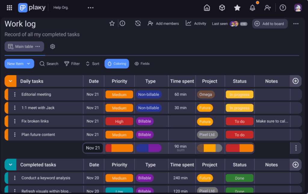 Another plus is that you can categorize tasks by their status: completed, in progress, on hold, or blocked, as well as document any challenges and/or issues you’ve experienced.