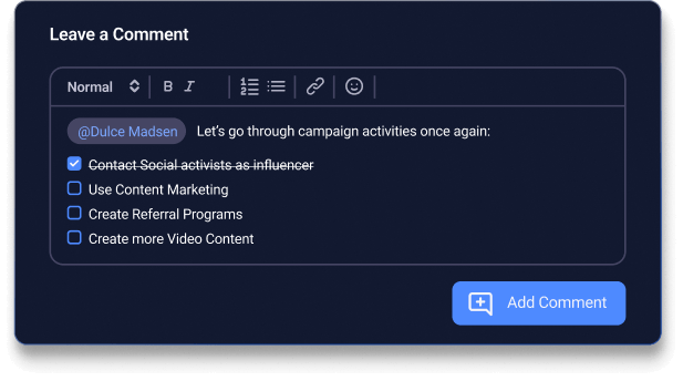 Centralize communication by storing all task-related discussions, feedback, approvals, and files right there in your task cards for easy tracking.