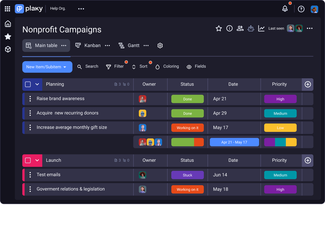 Bring your projects, team, volunteers, and contributors into one centralized hub with Plaky to easily manage your nonprofit and achieve visible results.