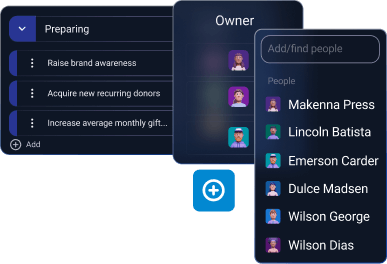 Tenha uma visão clara e deixe a equipe se alinhar com sua missão. Lance, gerencie e rastreie atividades de arrecadação de fundos, canais de doação e solicitações de subsídios. Faça orçamentos, priorize e atribua tarefas com facilidade.