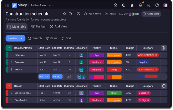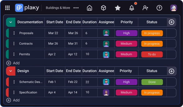 Use Plaky scheduling template to land on time and on budget with your construction activities.