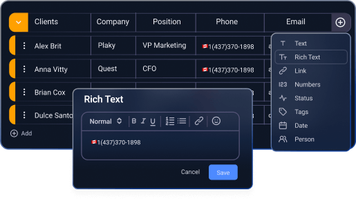 Fields in Plaky can categorize your tasks in many ways. You can have a field for clients' phone details, email address, geographical location, dates of interaction and much more. Keep everything in your task and access this valuable data, anytime, anyplace.