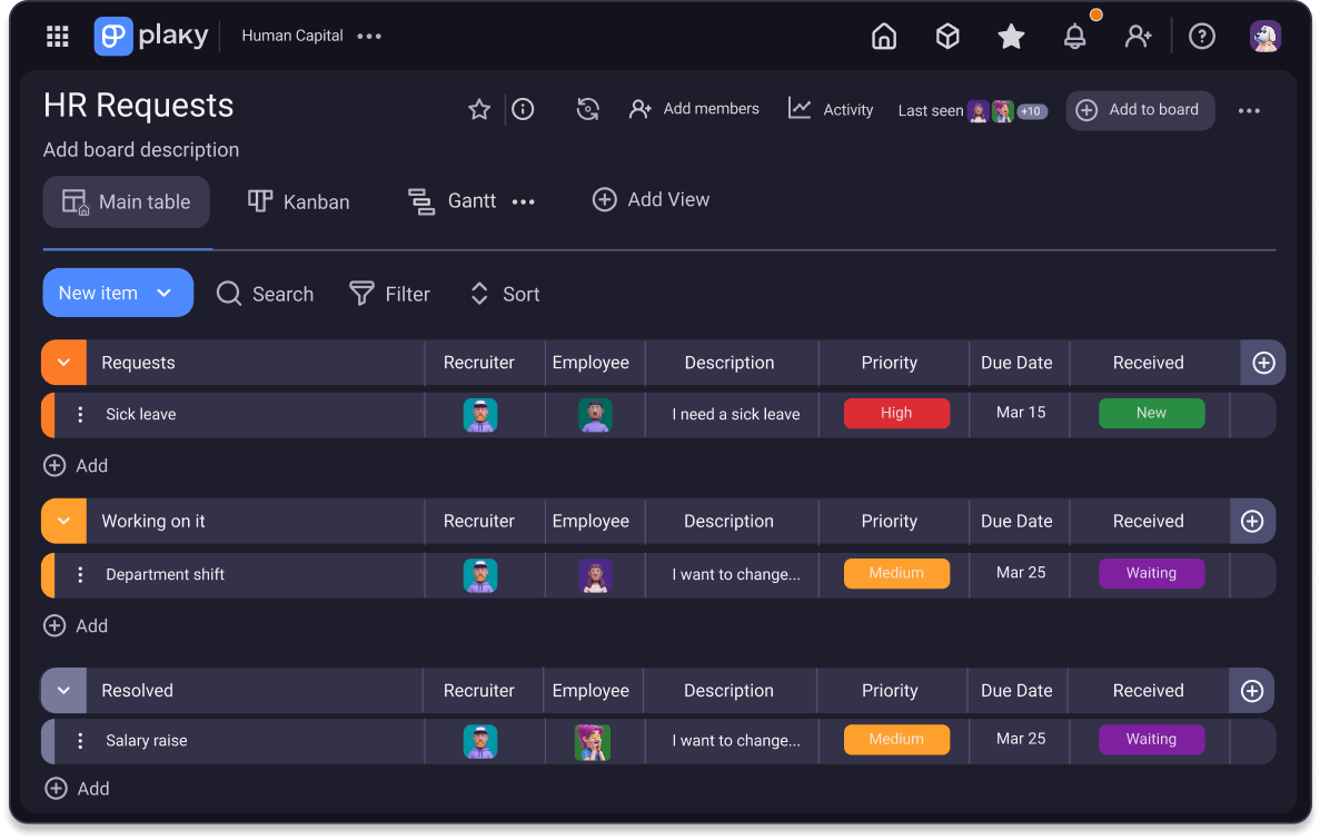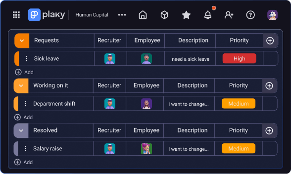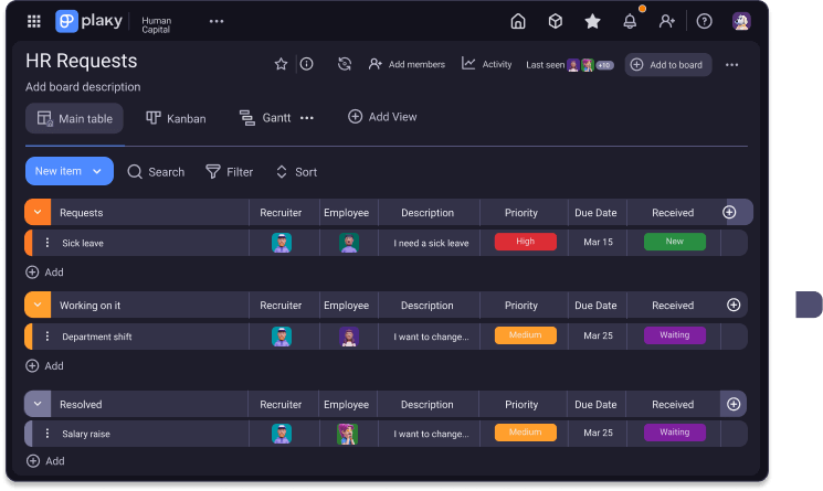 Manage all requests for a vacation leave, a department change, or an employee termination, in one place with the HR requests template.